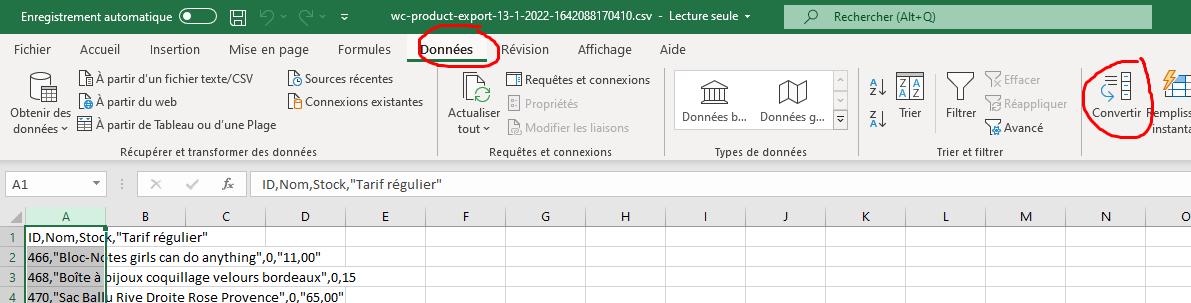 7. Cliquez sur le menu « données » et ensuite « convertir »